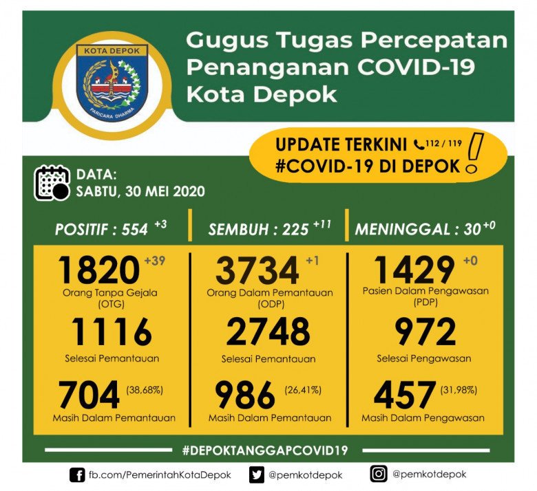 CITRADEPOK.COM | Depok – Pemerintah Kota (Pemkot) Depok kembali memperbarui data perkembangan kasus virus Corona atau Covid-19 di Kota Depok. Berdasarkan data yang dirilis, hari ini jumlah pasien sembuh Covid-19 bertambah sebanyak 11 orang sehingga totalnya menjadi 225 orang atau mencapai 40,6 persen.