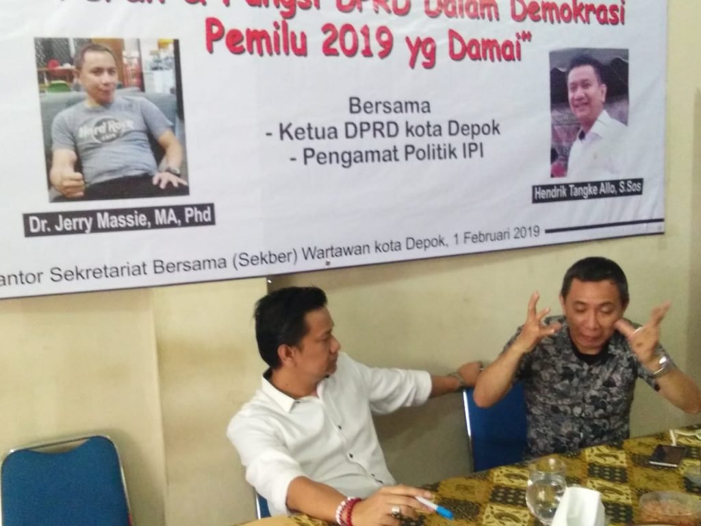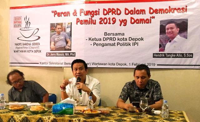 SUARA JABAR SATU.COM | DEPOK – Ngopi Bareng Sekber Wartawan Kota Depok Sessi ke-8 menghadirkan pembicara dari dua Narasumber Ketua DPRD Kota Depok Hendrik Tangke Allo, Pengamat dan Peneliti dari Indonesia Publik Institute (IPI) Jerry Massie.